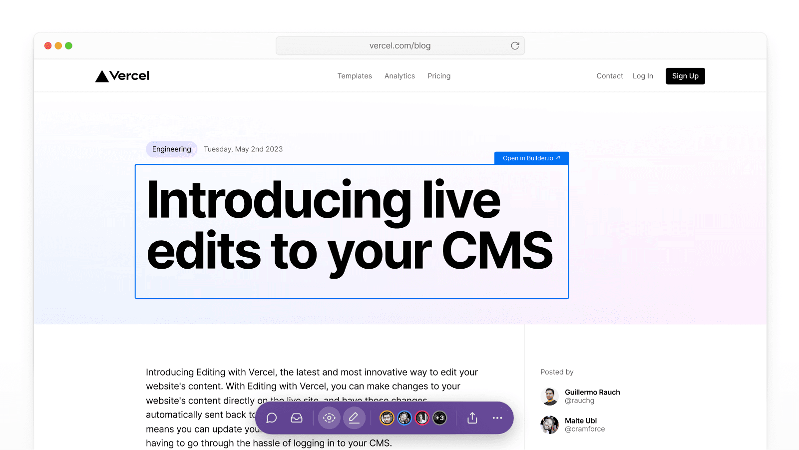 Visual Editing was another big step in bringing accessible collaboration to web development with a direct connection to your headless CMS. Since Vercel Ship, we have been working to onboard new customers like HashiCorp, Sonos, and Tome and we're happy to share that Visual Editing is now in public beta for Pro and Enterprise teams.