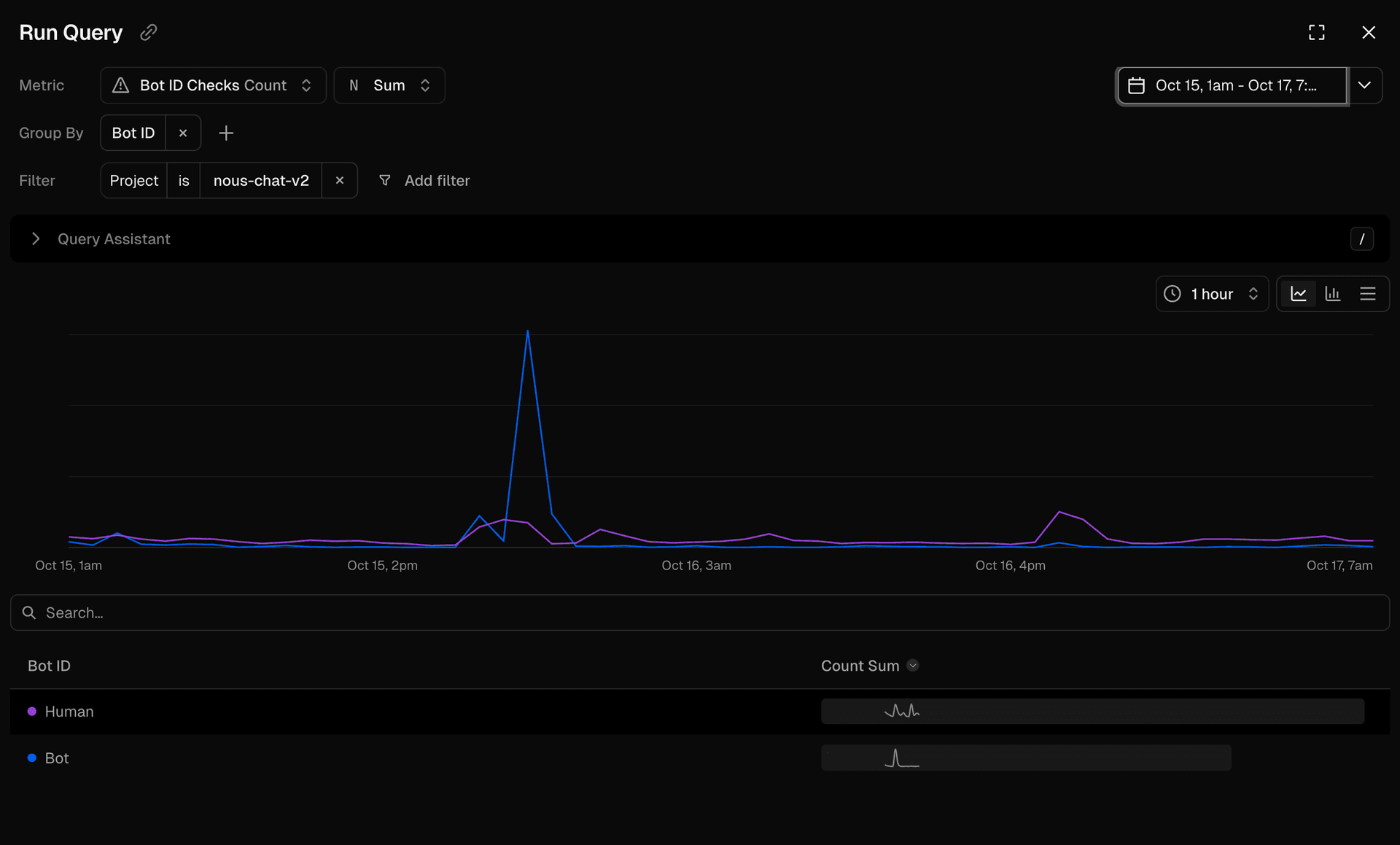 By deploying Vercel BotID at multiple points in its user flow, Nous Research prevented large-scale automated abuse before it could impact infrastructure, reduced wasted inference costs, and maintained app availability for its free tier without compromising security or user experience. And because BotID responded automatically, Nous did not have to spend valuable time or resources triaging traffic issues. Now they can continue their mission to host a free, open-source LLM for users around the world safely.