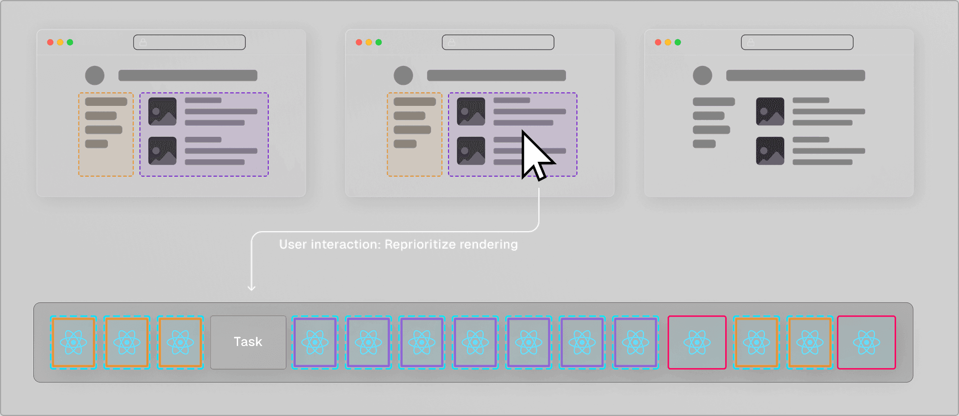 When rendering the low-priority components (pink), React yields back to the main thread to check for more important tasksWhen rendering the low-priority components (pink), React yields back to the main thread to check for more important tasks