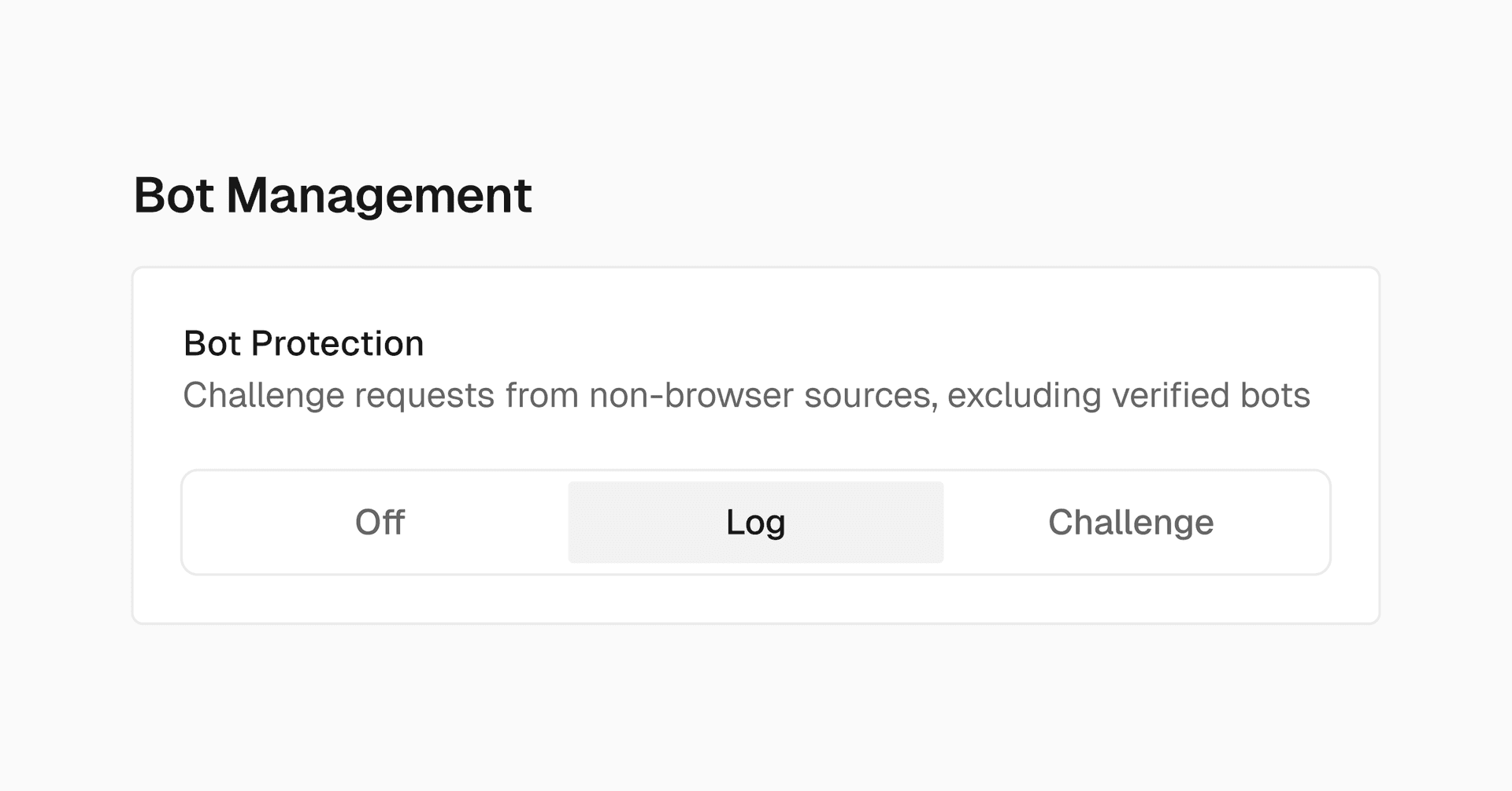 Bot Protection ties directly into the WAF. As a managed ruleset, we maintain the list of verified bots to ensure authenticity and reduce maintenance overhead.