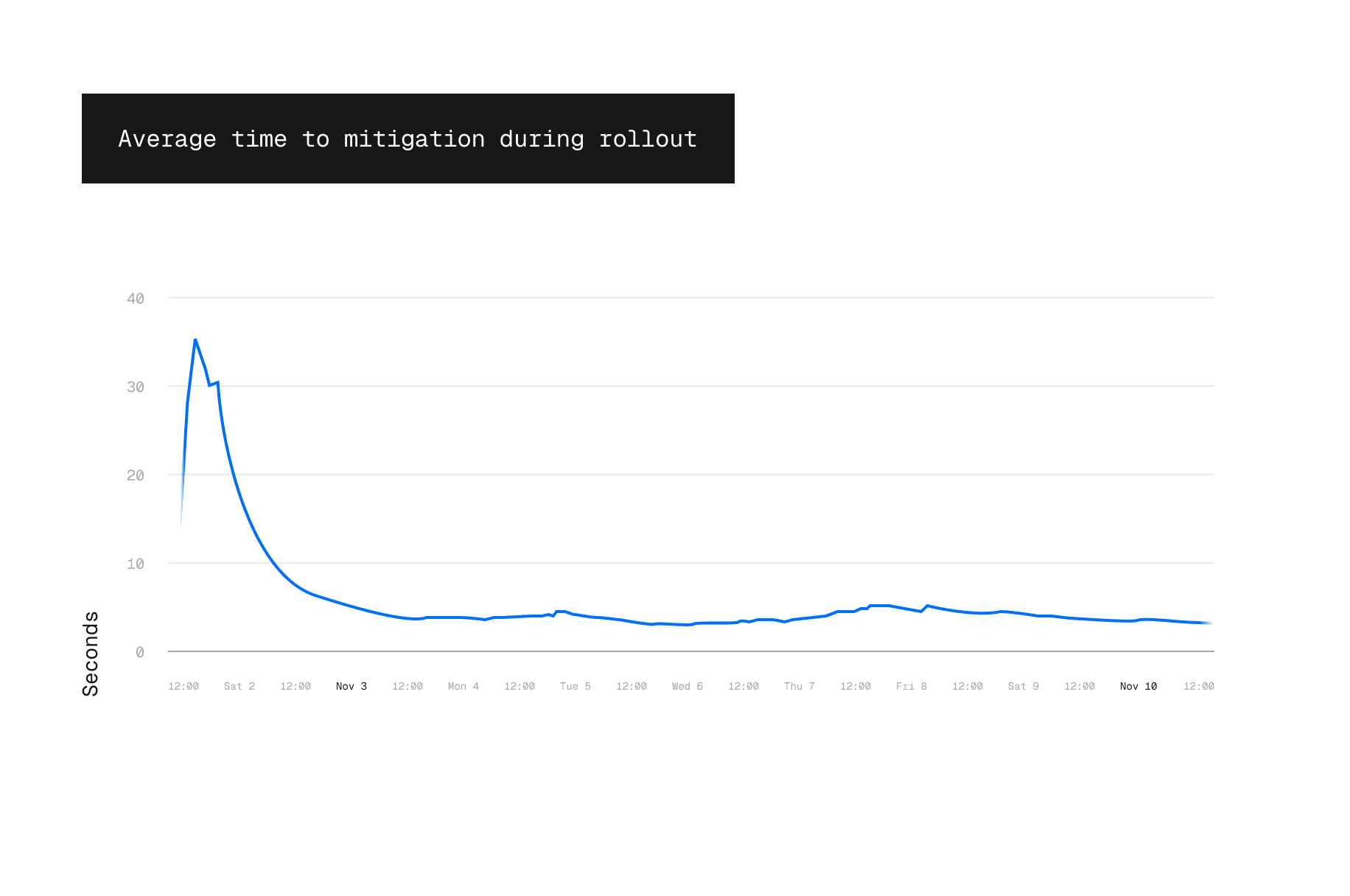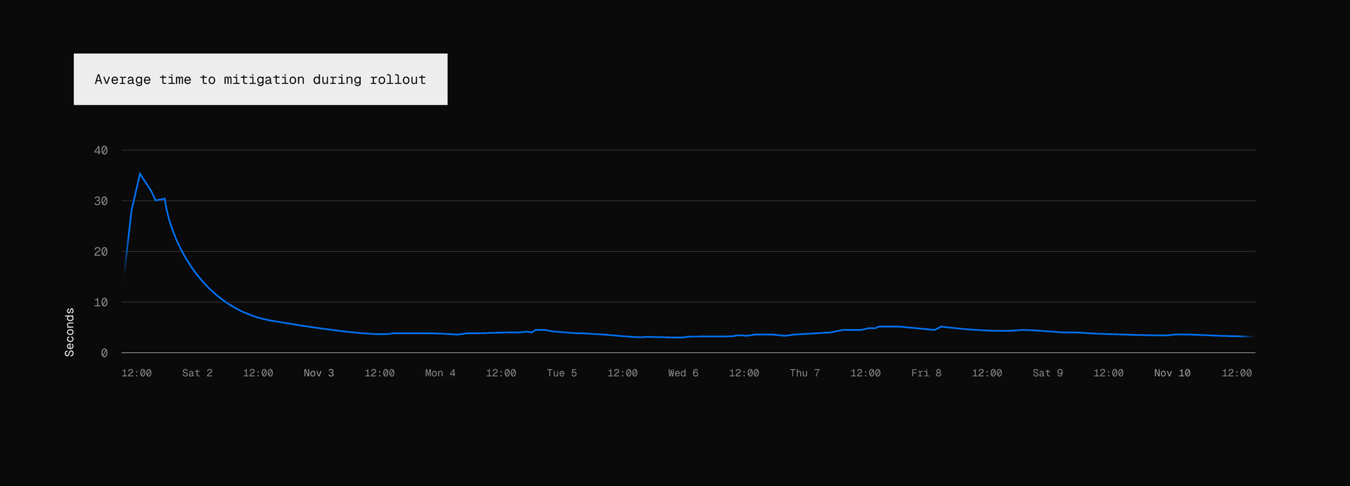 Since fully rolling out Protectd in January 2025, a process that began in November, every Vercel user now benefits from a significantly faster, more adaptive security infrastructure. The system consistently delivers a P99 time to mitigation of 3.5 seconds, a P50 of 2.5 seconds, and can respond to threats in as little as 0.5 seconds.