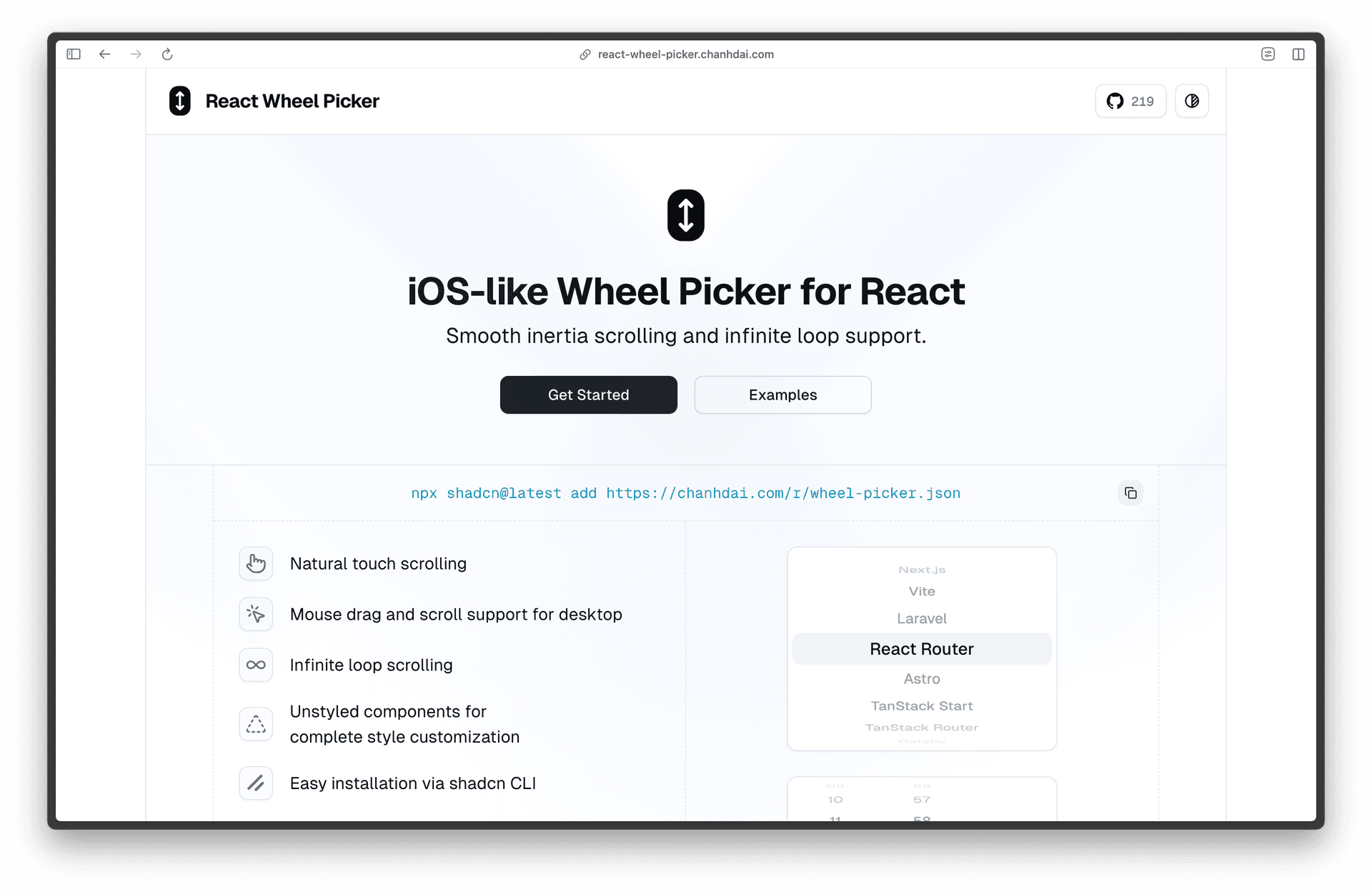 A clean, mobile-style picker for React apps. Lightweight, smooth, and ready to drop into any form.