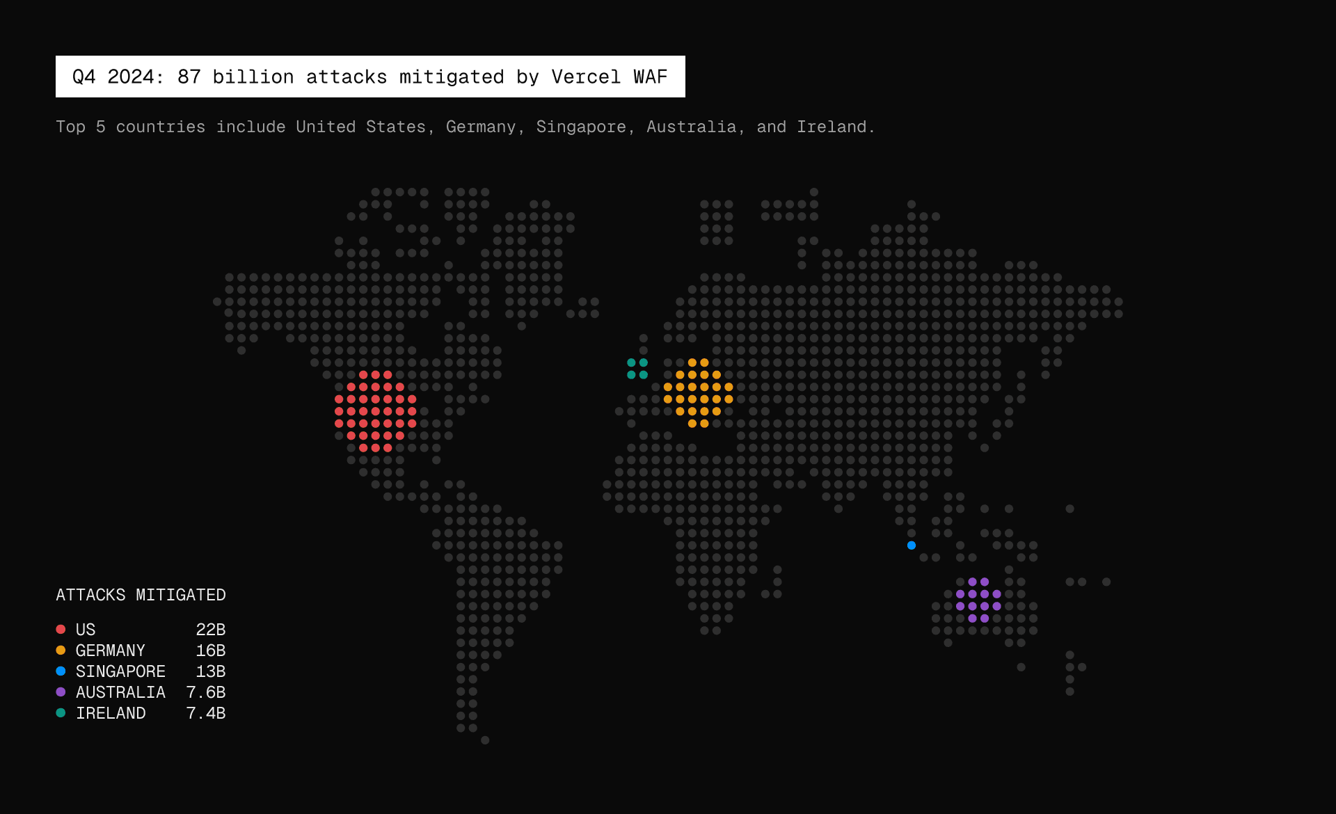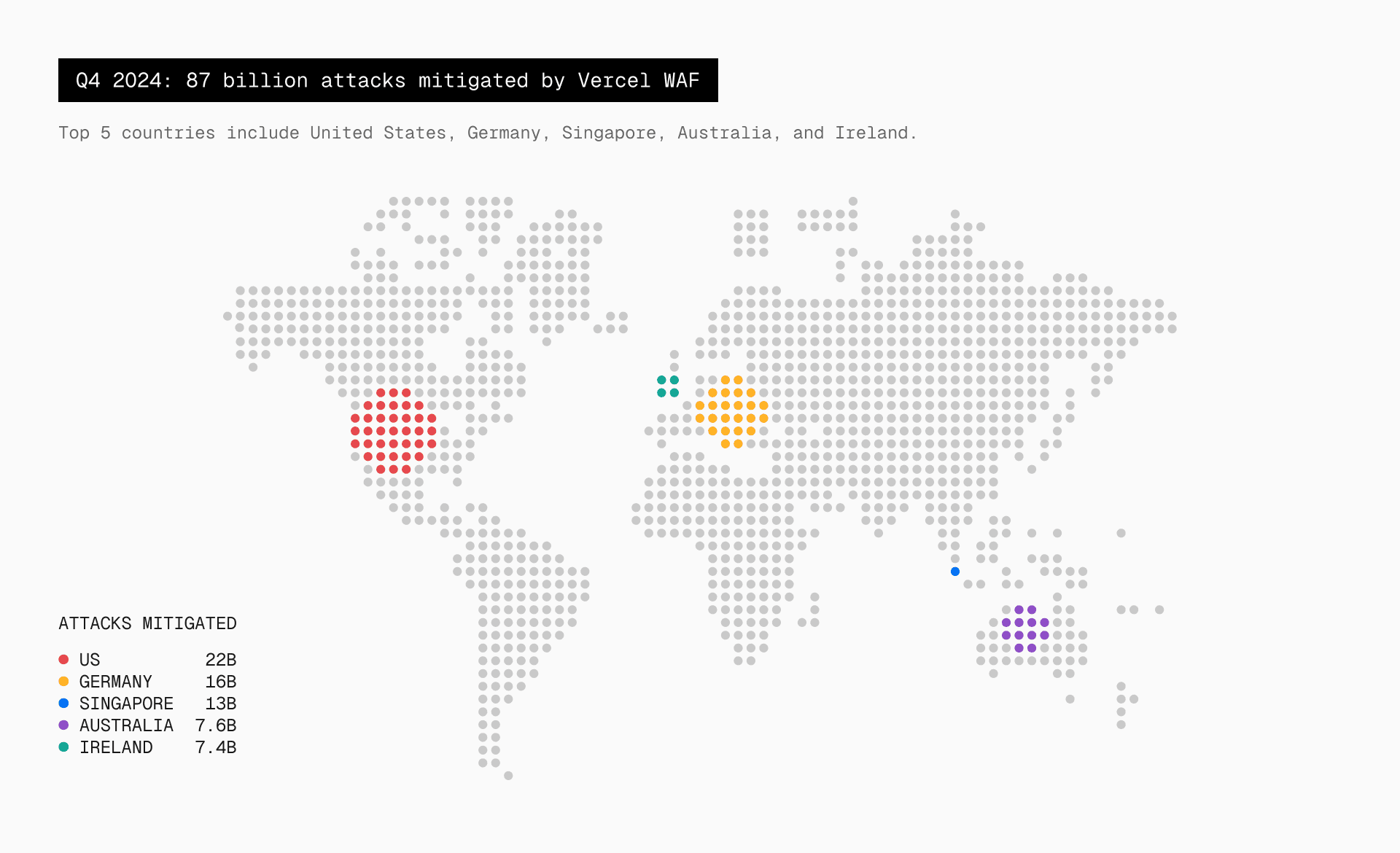 In the last quarter of 2024, Vercel’s WAF automatically mitigated 87 billion attacks from 19 million unique IPs—blocking malicious traffic before it ever reached customer applications. Our platform security combines multiple layers of protection: