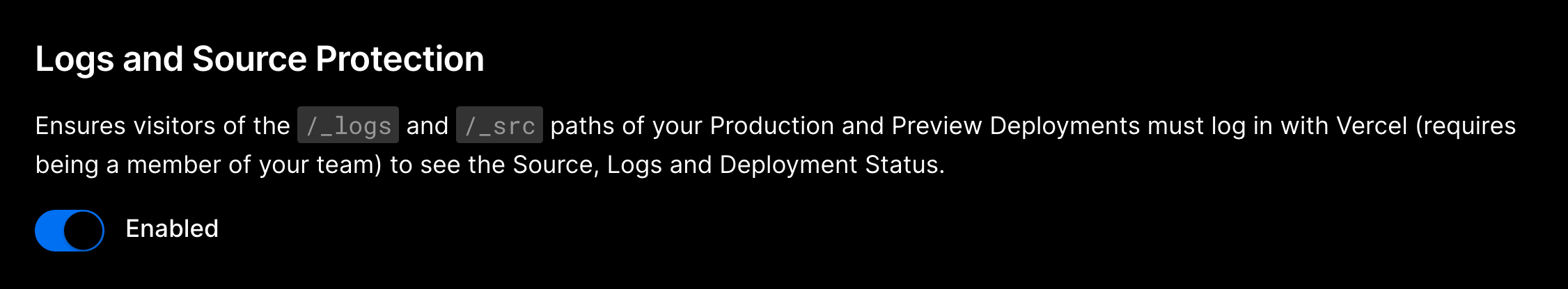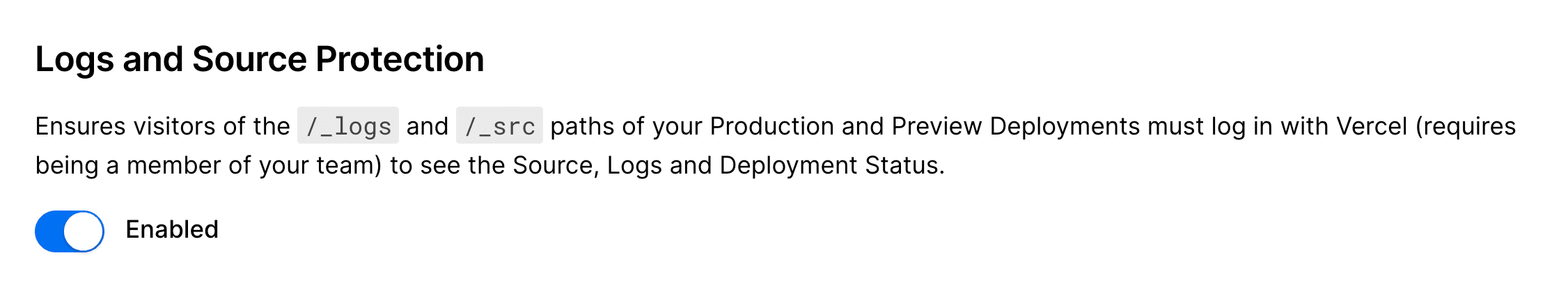 Vercel allows you to access the source code and build logs for your deployment using special pathnames for Build Logs and Source Protection. You can access this option from your project's Security settings.
