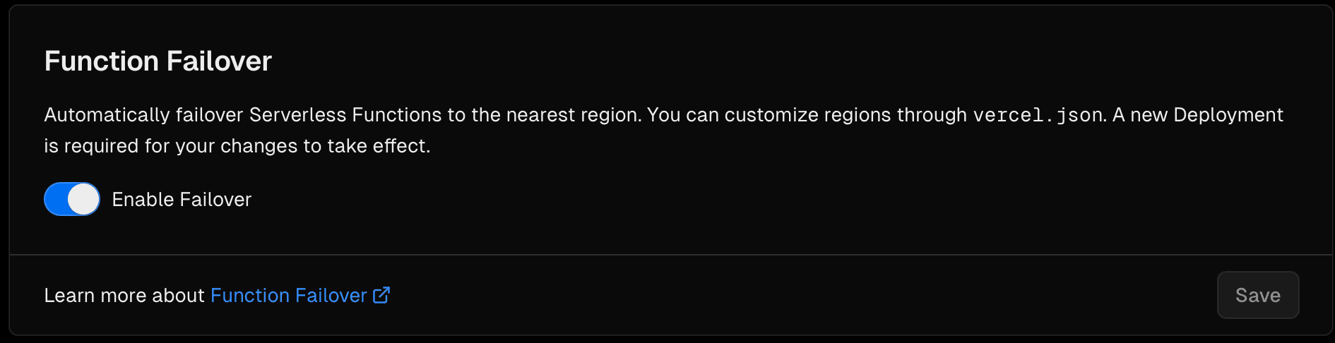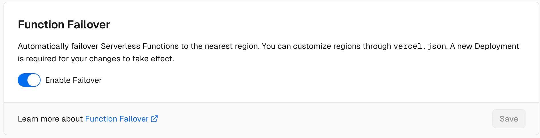 Enterprise teams can enable multi-region redundancy for Vercel Functions using Node.js.