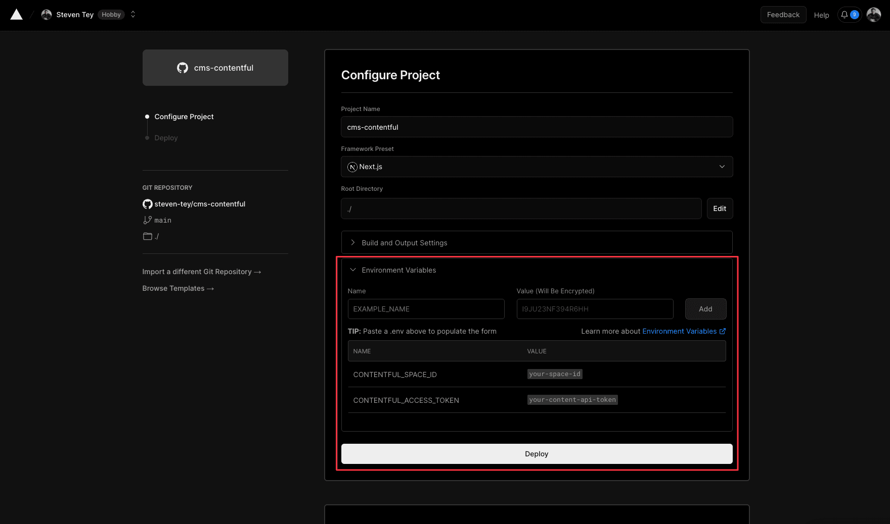 If you already have a Vercel deployment and a Contentful account, you should install the Contentful Integration to connect your Space to your Vercel project. To finish, the important parts that you need to know from the QuickStart are: