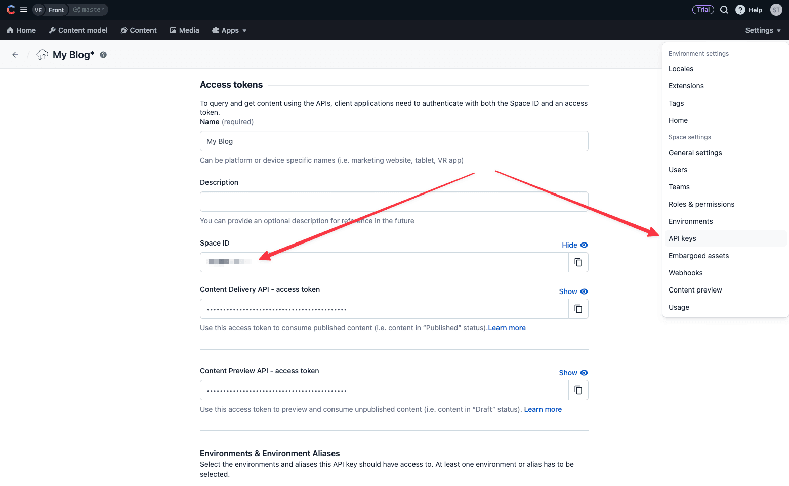3. The Vercel integration uses your Contentful Space ID to communicate with Contentful. To find this, navigate to your Contentful dashboard and select Settings > API Keys. Click on Add API key and you will see your Space ID in the next screen.
