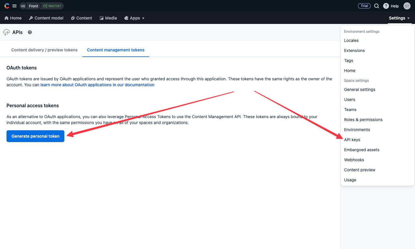 4. You will also need to create a Content Management API token for Vercel to communicate back and forth with the Contentful API. You can get that by going to Settings > API Keys > Content management tokens.