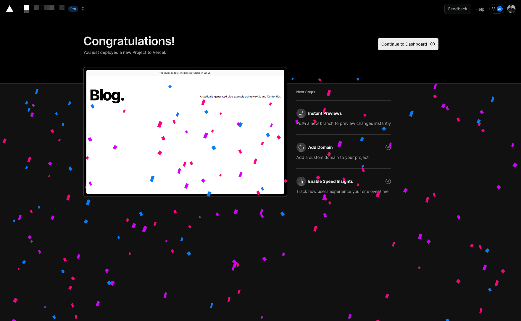 Now that you have your application wired up to Contentful, you can deploy it to Vercel to get your site online. You can either use the Vercel CLI or the Git integrations to deploy your code. Let’s use the Git integration.
