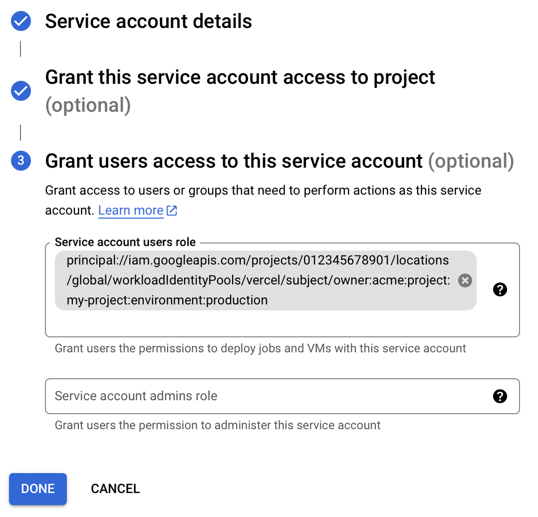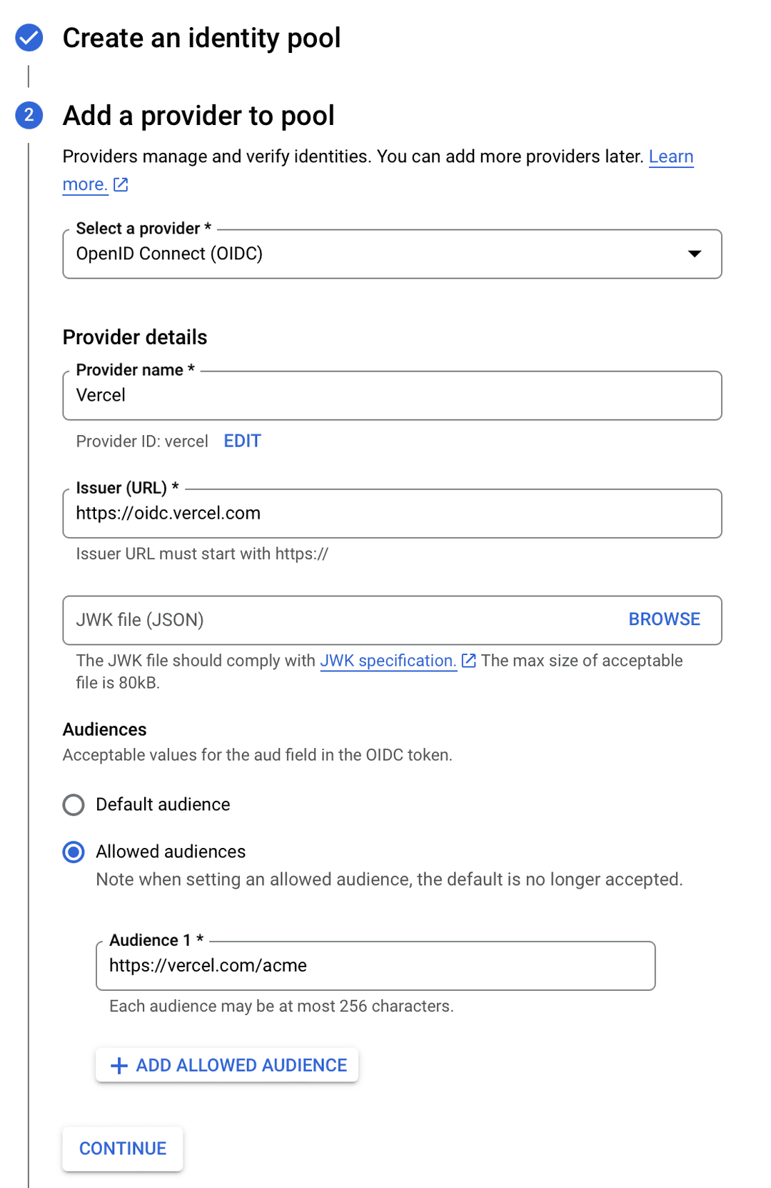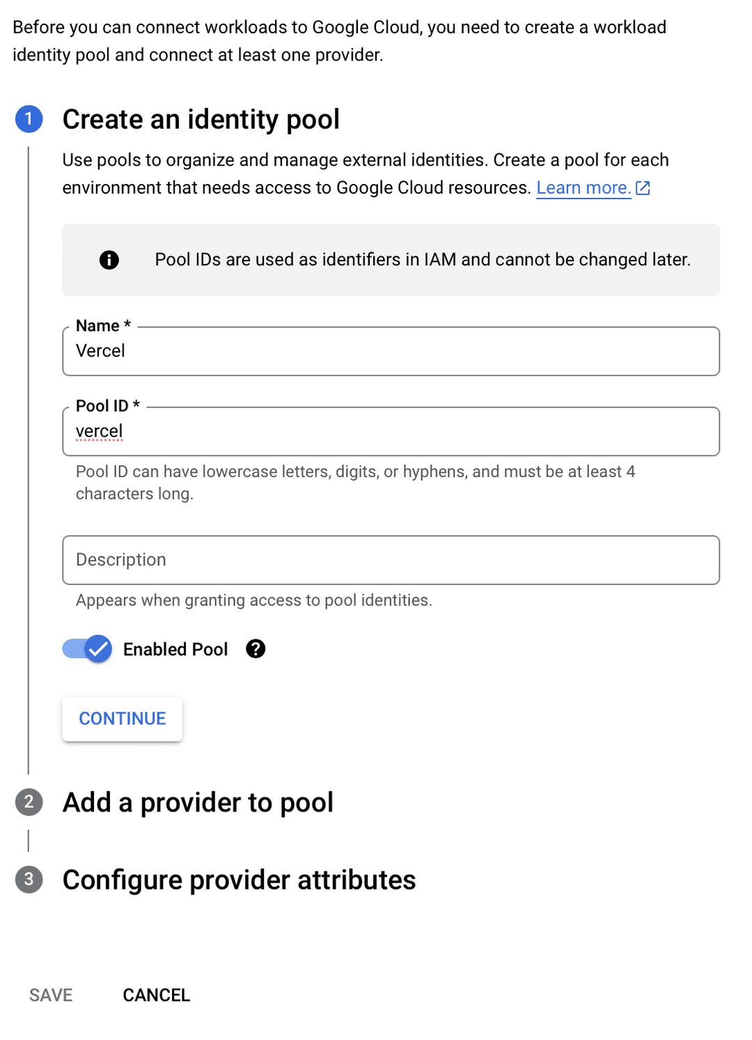 Value Location Environment Variable Example Project ID IAM & Admin -> Settings Project Number IAM & Admin -> Settings Service Account Email IAM & Admin -> Service Accounts Workload Identity Pool ID IAM & Admin -> Workload Identity Federation -> Pools Workload Identity Pool Provider ID IAM & Admin -> Workload Identity Federation -> Pools -> Providers Then, declare them as environment variables in your Vercel project.