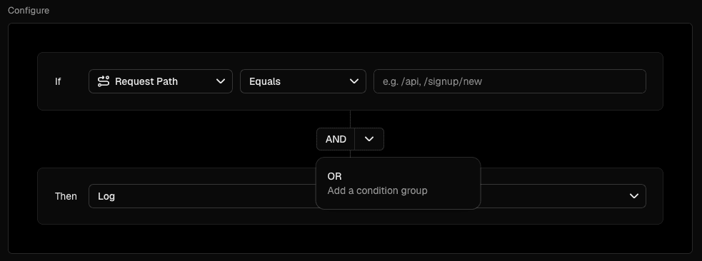 5. In the Configure section, add as many If conditions as needed. For each condition you add, choose how you will combine it with the previous condition using the AND (Both conditions need to be met) or the OR operator (One of the conditions need to be met).