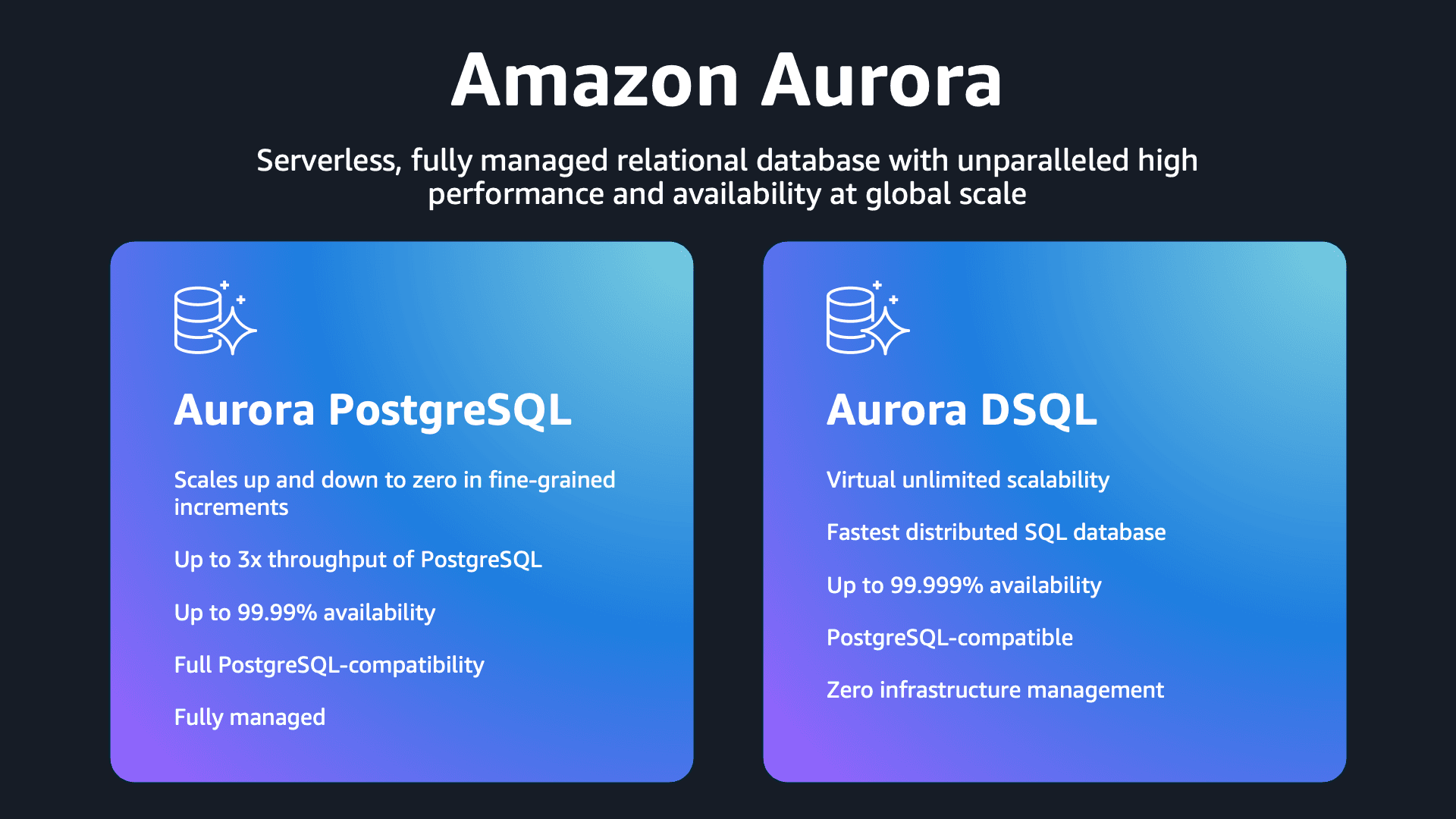 Build at the speed of an idea with AWS Databases. Create a new database in seconds and add features on-demand as your application grows. Focus on coding, not infrastructure management—our serverless, fully managed PostgreSQL and NoSQL databases automatically scale with your workload while you only pay for what you use. Whether you're prototyping your next big idea or powering production AI and data-driven applications, AWS Databases deliver the security, reliability, and price performance you need without the operational overhead.