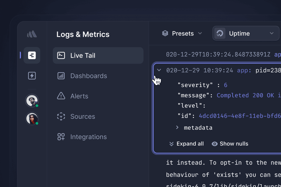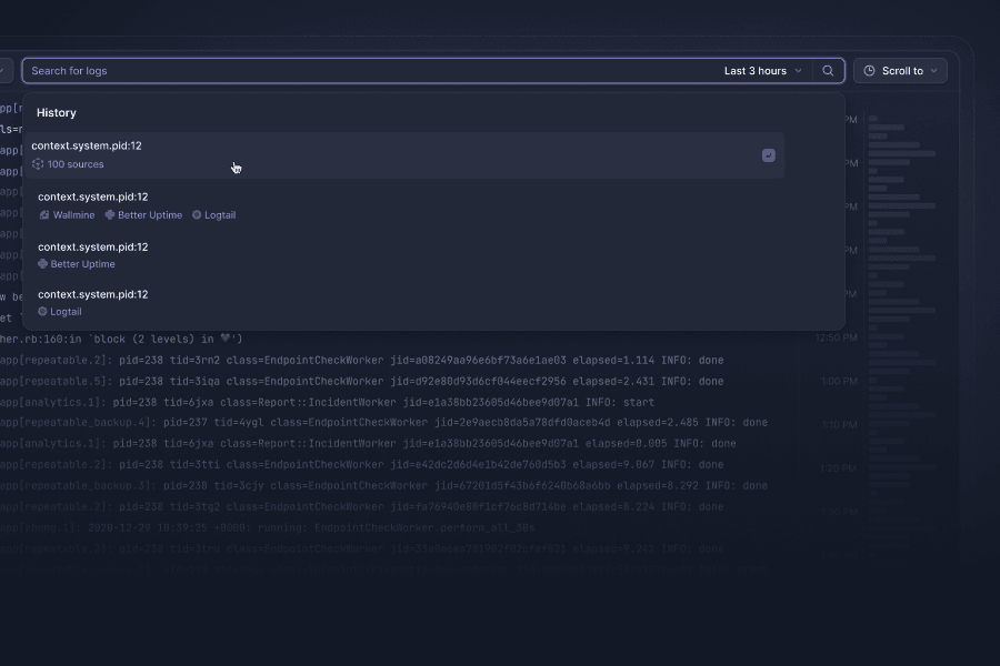 We will set up a log drain for each of your selected projects. Vercel will automatically start sending your logs to Better Stack and they'll appear in real-time on the Live tail page. You can search your logs and explore values of any field.