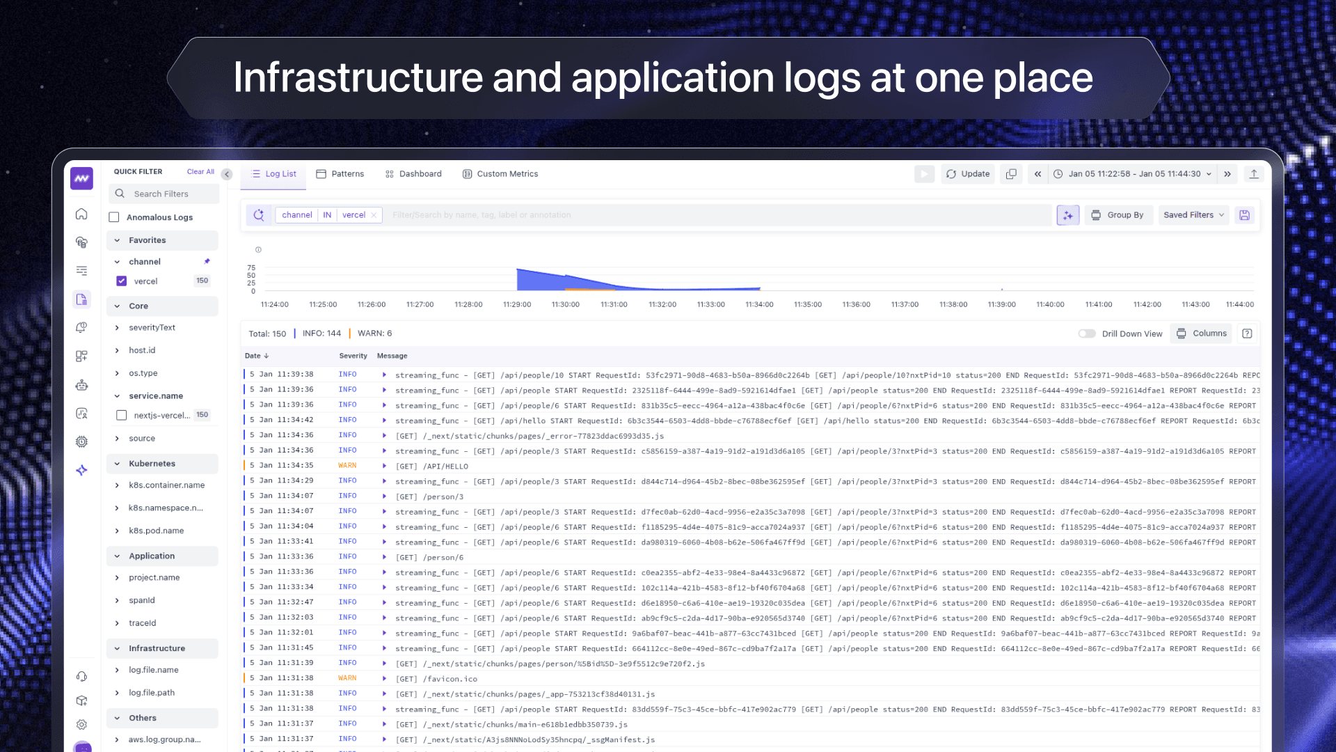 This integration offers a robust APM solution through a unified dashboard with automatic correlation between logs and traces. Monitor all Vercel log sources across production and preview environments, set up alerts, create custom dashboards, and gain insights into performance, latency, and error rates - all without code changes.