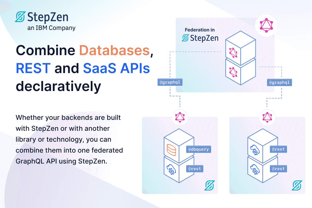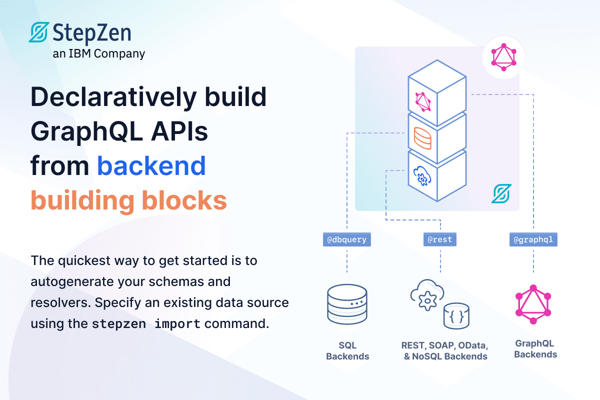 With StepZen you can generate GraphQL APIs for all your data sources in a declarative way. This includes SQL/NoSQL databases, REST APIs, SOAP and other GraphQL APIs.
